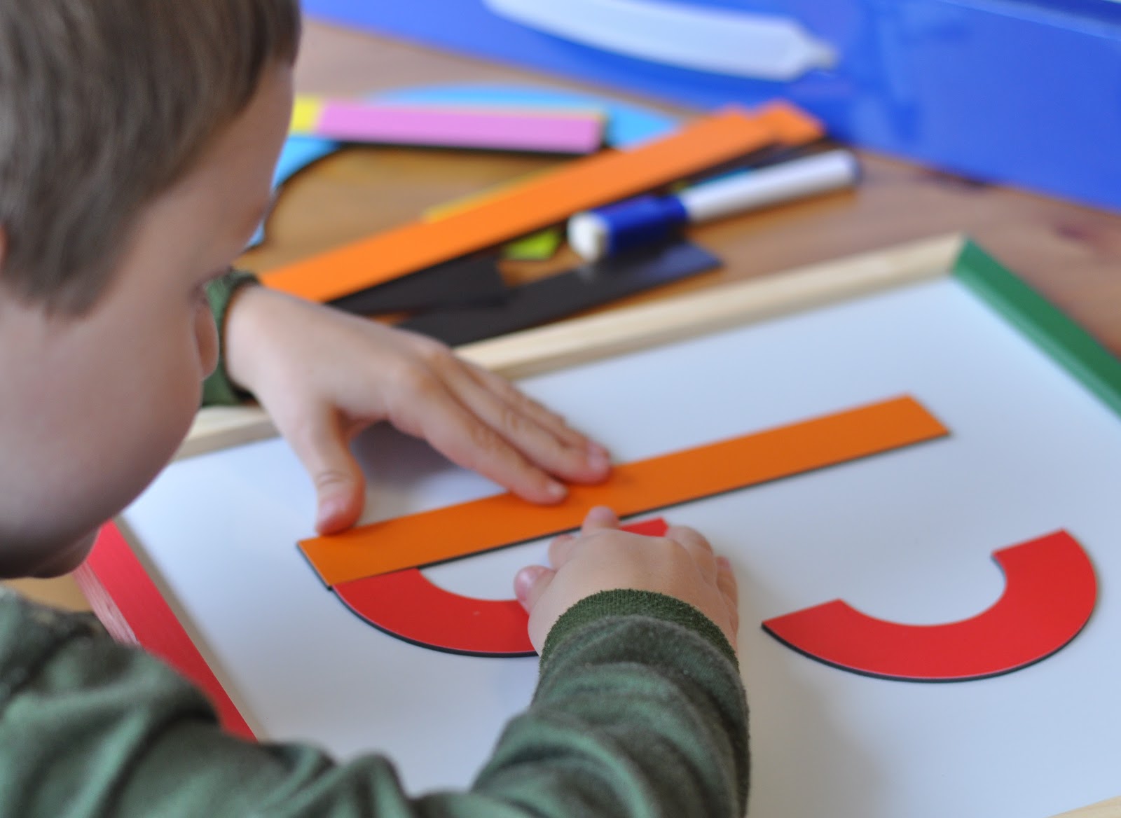 Dodson loved using the magnastix. These are some heavy duty products that really worked his muscles! It is like a puzzle, so lots of fun for the kids to find the right pieces needed to build each letter. The guide inside tells which color magnastix and how many of each color needed to build a specific letter. It is a challenge that is fun and rewarding!
